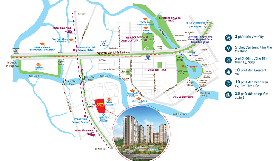 Với vị trí đắc địa ven sông Rạch Đĩa trên tuyến đường huyết mạch Nguyễn Hữu Thọ (Phước Kiển, Nhà Bè), cư dân Saigon South Residences dễ dàng kết nối đến trung tâm Phú Mỹ Hưng chỉ trong 5 phút, Quận 1 khoảng 15 phút, và di chuyển linh hoạt đến các tiện ích như VivoCity, Crescent Mall, bệnh viện FV, RMIT … chỉ trong 3–10 phút.